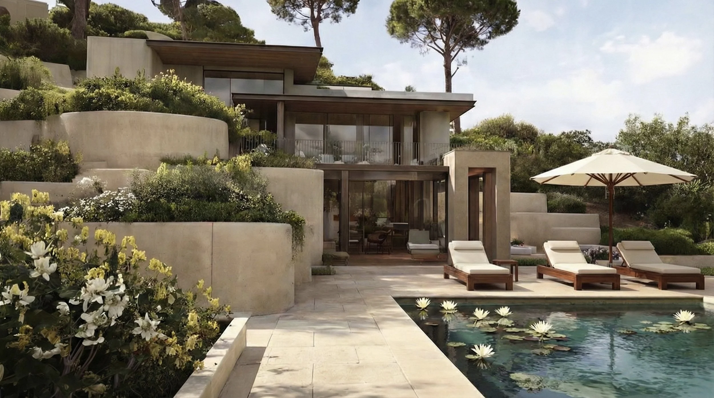 A high-luxury retreat nestled in dramatic rocky cliffs and overlooking crystal-clear waters, where refined elegance blends with the raw beauty of nature.